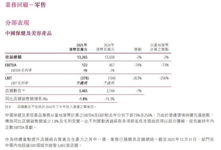 财报显示,屈臣氏在中国的营收规模将近132.65亿港元,较2024年的135.08亿港元下降2%;同期EBITDA(税息折旧及摊销前利润)为1.22亿港元,同比降幅高达74%。与此同时,中国地区门店也从2024年的3744家减少至3465家。可以看出,其多项核心业绩指标都出现了下滑。