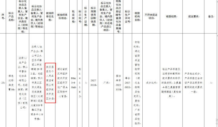 根据通报,在武汉屈臣氏个人用品商店有限公司经济技术开发区分店、青岛屈臣氏个人用品商店有限公司济宁运河路分店抽样的产品“探色幻彩染发膏06”,均出现了“成分比对”不符合规定的问题,相关产片为未标示2-氨基-4-羟乙氨基茴香醚硫酸盐的成分。